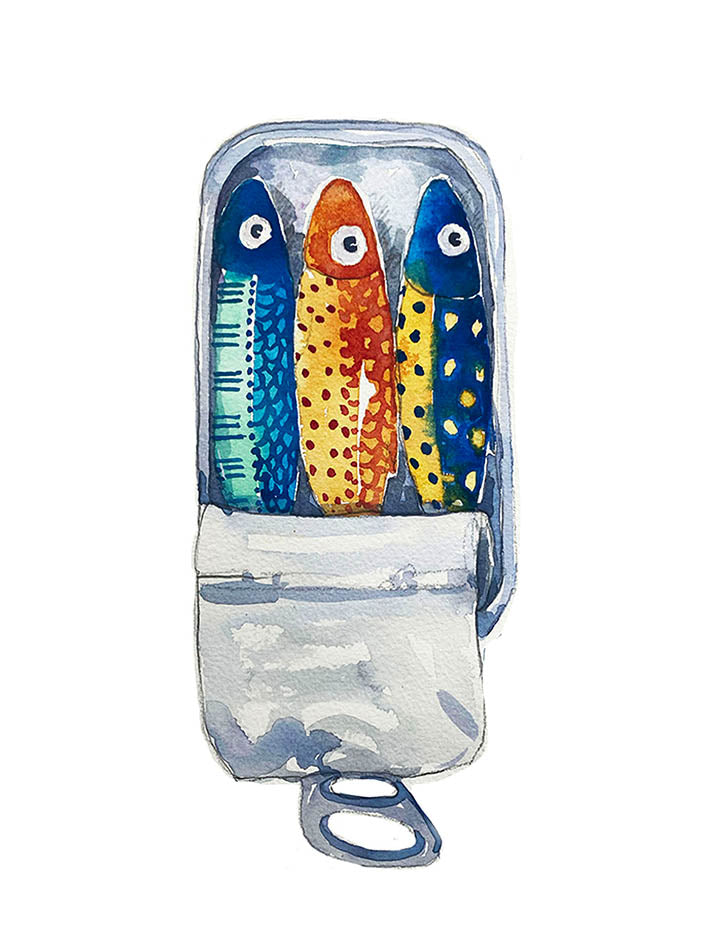 agoodcatchVibrant, right on trend, watercolor of colorful sardines. Inspired by many trips to Northern Portugal, these fun patterned fish brighten up any home.