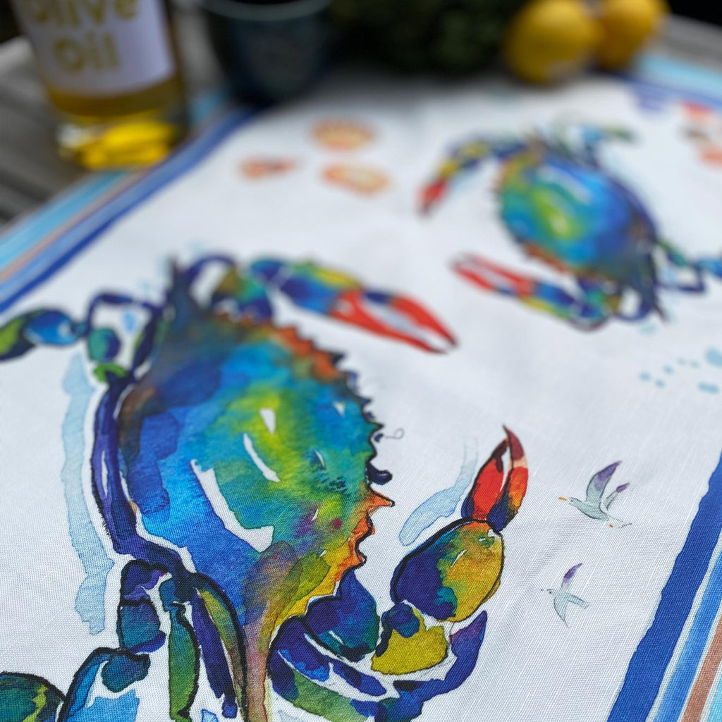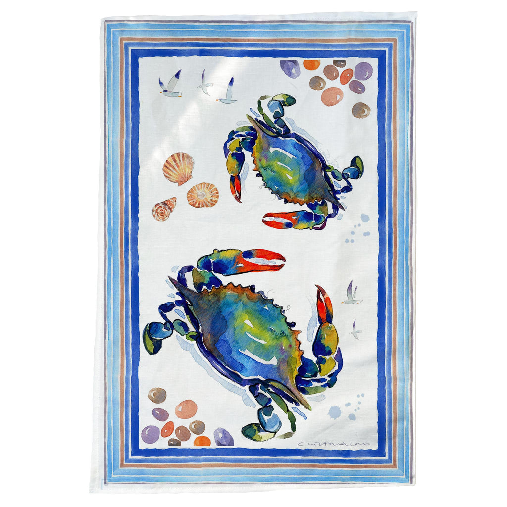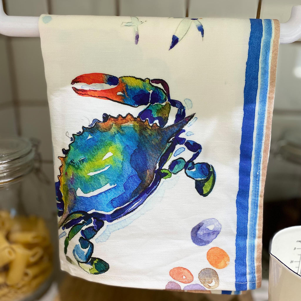 ShopifyThe Blue Crab Tea Towel is our number one selling Kitchen Towel. Vibrant watercolor art lends itself perfectly to the Blue Crab. 60% Linen 40% Cotton it is digitally printed in North Carolina, machine washable, long-lasting, sustainable and 100% made in America.